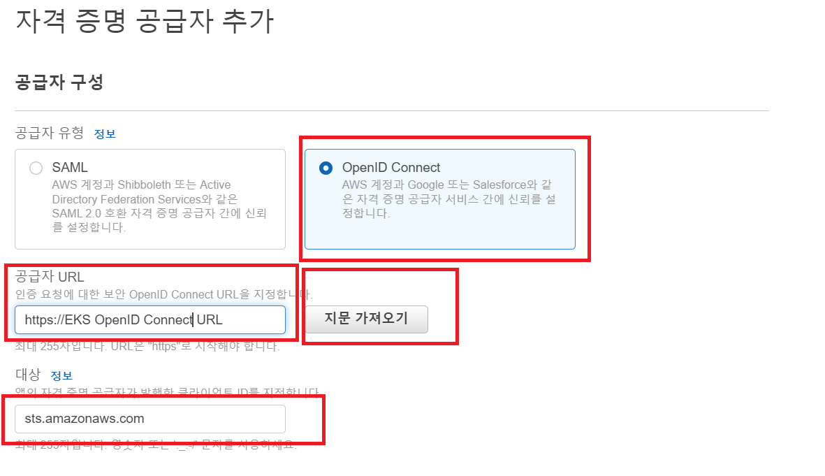 - 공급자 URL 에 EKS 개요 탭에 있는 'OpenID Connect 공급자 URL' 복사하여 입력 -> 지문 가져오기