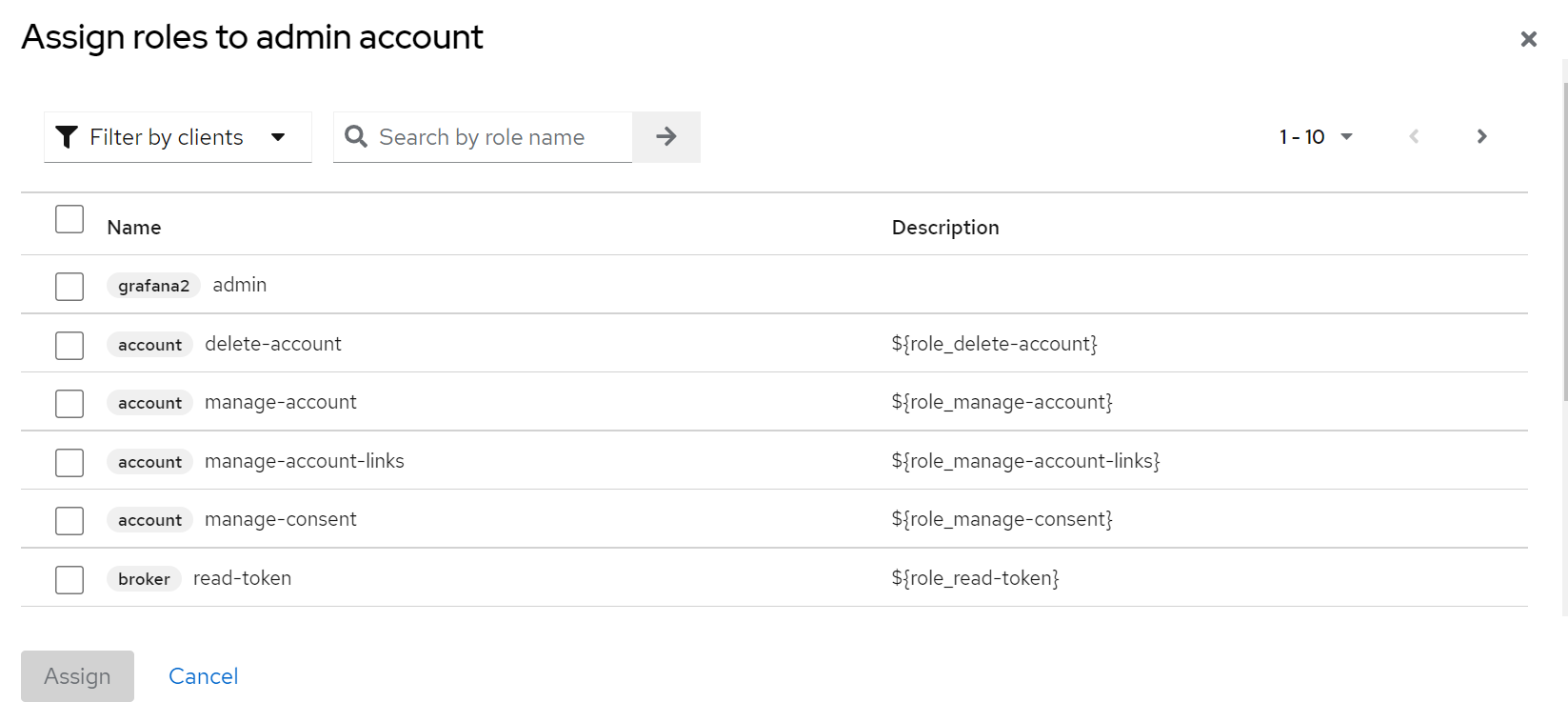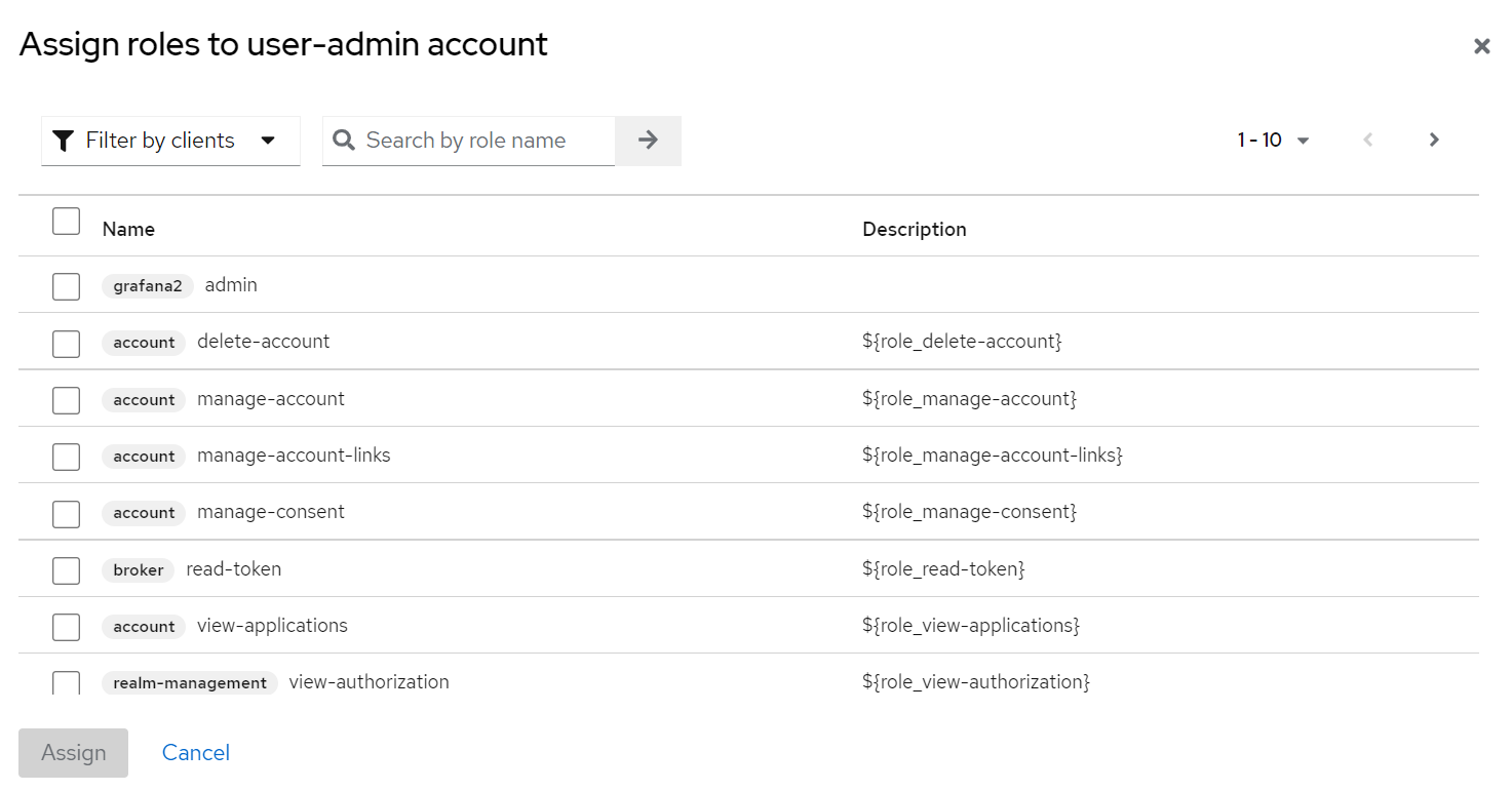 - Assign roles to user-admin account 에서 Filter by Clients 클릭 후 admin 권한 추가